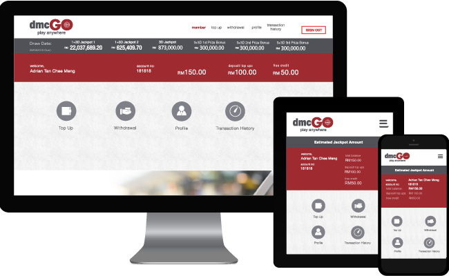 As a privileged dmcGO account holder, you can easily manage your account by securely logging in to the web portal exclusive to members only. Top up your account, withdraw winnings, check your account history or update your particulars in a few simple clicks.