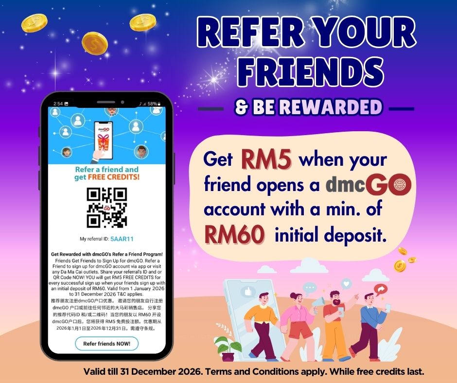 Share your REFERRAL ID with your friends to sign up dmcGO account with a minimum RM60 deposit and you will GET RM5 free credits. Refer more friends to get more free credits.