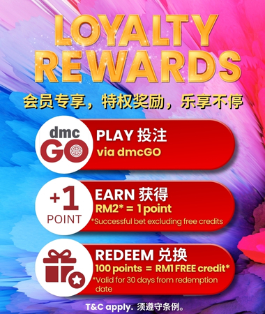 Your spending with dmcGO now earns you points at the highest rate. Get 1.76 loyalty points for every RM2 in eligible bets.